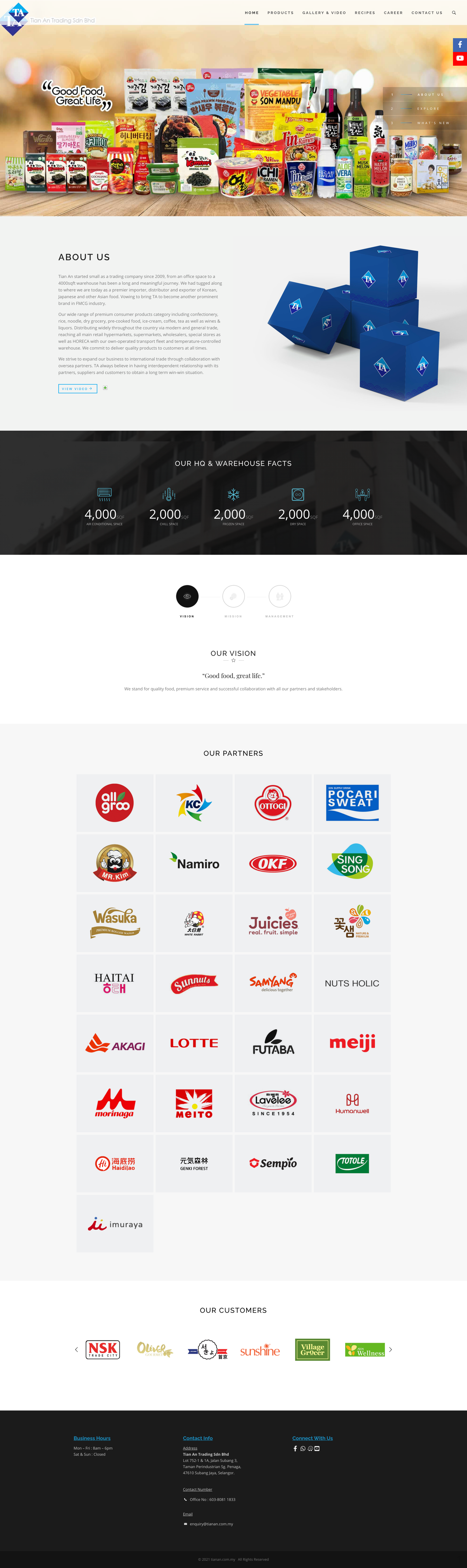 Tian An started small as a trading company since 2009, from an office space to a 4000sqft warehouse has been a long and meaningful journey.Had tugged along to where are today as a premier importer, distributor and exporter of Korean, Japanese and other Asian food. Vowing to bring TA to become another prominent brand in FMCG industry.